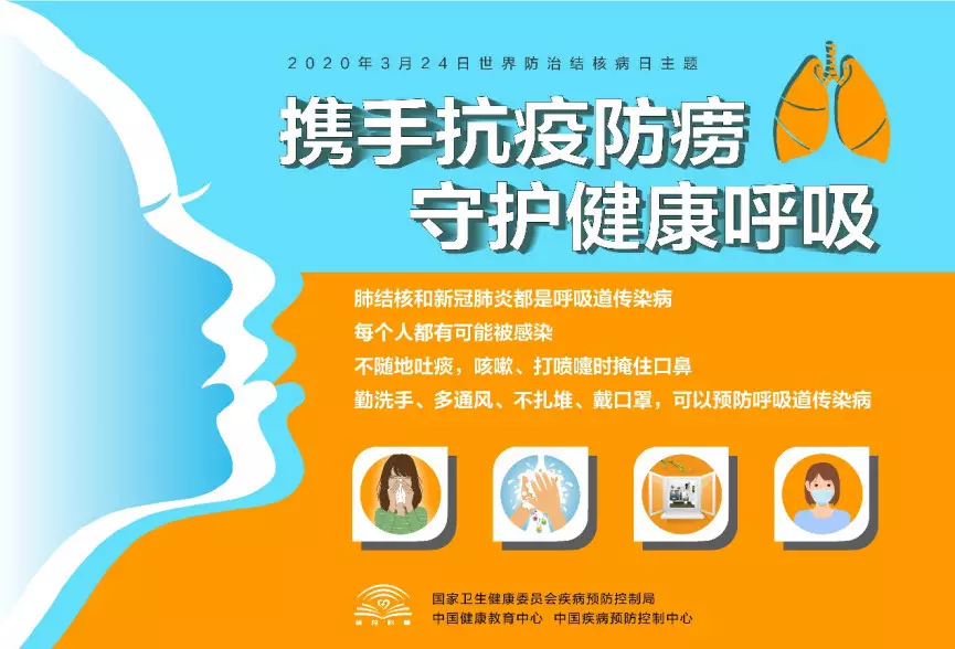 今年我国的宣传主题是 “携手抗疫防痨 守护健康呼吸” 这个主题寓意着在当前新冠肺炎疫情防控形势不断向好的情况下,另一种通过飞沫传播的慢性呼吸道传染病——肺结核,也是当前严重危害人民健康的主要传染病,防治工作时不我待!我们呼吁大家继续团结一心,共同携手,积极为消灭新冠肺炎疫情、遏制结核病流行而不懈努力,并为消除这两种传染病的危害,保护人民生命安全和身体健康贡献力量。 每年3月24日世界防治结核病日,全国各界通过广泛动员,并组织开展多种形式的主题宣传活动,向公众普及结核病防治知识,倡导健康文明的行为习惯,强化每个人是自己健康第一责任人的意识,不断提升全民健康素养,推进早日实现终止结核病流行的目标。 结核病防治核心信息及知识要点 一、肺结核是长期严重危害健康的慢性传染病 1.结核病又叫“痨病”,由结核杆菌引起,主要侵害人体肺部,发生肺结核。 2.肺结核在我国法定报告甲乙类传染病中发病和死亡数排在第2位。 3.得了肺结核如发现不及时,治疗不彻底,会对健康造成严重危害,甚至可引起呼吸衰竭和死亡,给患者和家庭带来沉重的经济负担。 二、肺结核主要通过呼吸道传播,人人都有可能被感染 1.肺结核是呼吸道传染病,很容易发生传播。 2.肺结核病人通过咳嗽、咳痰、打喷嚏将结核菌播散到空气中,健康人吸入带有结核菌的飞沫即可能受到感染。 3.与肺结核病人共同居住,同室工作、学习的人都是肺结核病人的密切接触者,有可能感染结核菌,应及时到医院去检查排除。 4.艾滋病毒感染者、免疫力低下者、糖尿病病人、尘肺病人、老年人等都是容易发病的人群,应每年定期进行结核病检查。 三、咳嗽、咳痰2周以上,应怀疑得了肺结核,要及时就诊 1.肺结核的常见症状是咳嗽、咳痰,如果这些症状持续2周以上,应高度怀疑得了肺结核,要及时到医院看病。 2.肺结核还会伴有痰中带血、低烧、夜间出汗、午后发热、胸痛、疲乏无力、体重减轻、呼吸困难等症状。 3.怀疑得了肺结核,要及时到当地结核病定点医疗机构就诊。县(区、旗)、地市、省(区、市)等区域均设有结核病定点医疗机构。 四、不随地吐痰,咳嗽、打喷嚏时掩口鼻,戴口罩可以减少肺结核的传播 1.肺结核病人咳嗽、打喷嚏时,应当避让他人、遮掩口鼻。 2.肺结核病人不要随地吐痰,要将痰液吐在有消毒液的带盖痰盂里,不方便时可将痰吐在消毒湿纸巾或密封痰袋里。 3.肺结核病人尽量不去人群密集的公共场所,如必须去,应当佩戴口罩。 4.居家治疗的肺结核病人,应当尽量与他人分室居住,保持居室通风,佩戴口罩,避免家人被感染。 5.肺结核可防可治。加强营养,提高人体抵抗力,有助于预防肺结核。 五、规范全程治疗,绝大多数患者可以治愈,还可避免传染他人 1.肺结核治疗全程为6-8个月,耐药肺结核治疗全程为18-24个月。 2.按医生要求规范治疗,绝大多数肺结核病人都可以治愈。自己恢复健康,同时保护家人。 3.肺结核病人如果不规范治疗,容易产生耐药肺结核。病人一旦耐药,治愈率低,治疗费用高,社会危害大。