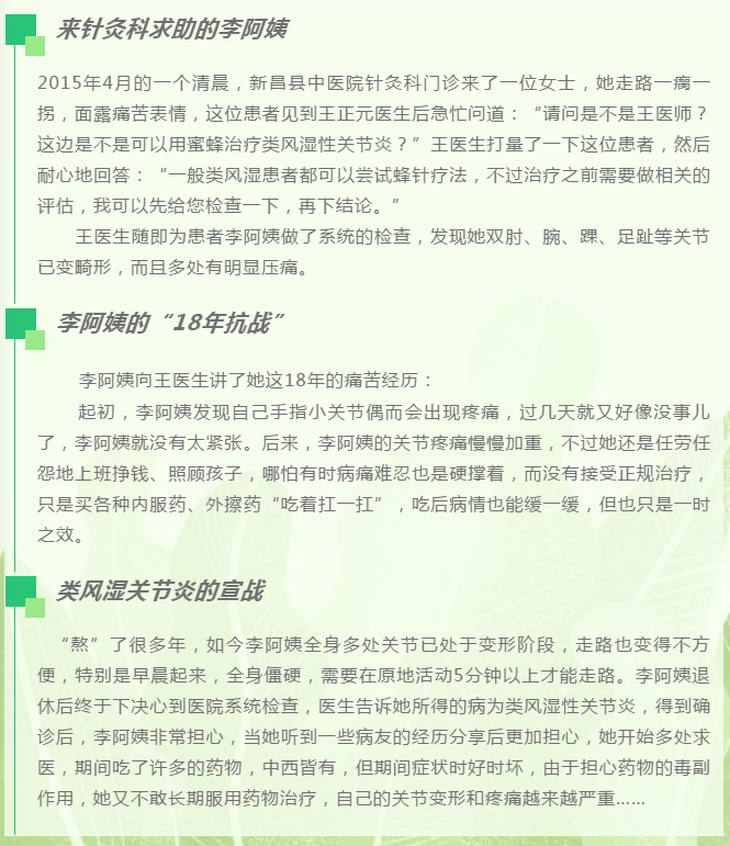 · 中医治疗类风湿性关节炎 · 类风湿性关节炎是一种以关节病变为主的慢性全身自身免疫性疾病。主要临床表现为小关节滑膜所致的关节肿痛,继而软骨破坏、关节间隙变窄,晚期因严重骨质破坏、吸收导致关节僵直、畸形、功能障碍。此疾病病程长,治疗困难,西医常采用非甾体抗炎药、免疫抑制剂等治疗,这些手段对症状和预后改善有一定作用,但若长期服用,对身体也会带来较大的副作用。 中医在治疗此类疾病有独特的认识与自身优势,蜂针疗法更是治疗此类疾病的一把利剑。可根据患者不同的情况制定不同的治疗方案,在蜂疗的同时,是否需要针灸、中药,甚至配合西药,具体治疗方案应人而异。 蜂针疗法主要治疗疾病:风湿性关节炎、类风湿性关节炎、强直性脊柱炎、颈肩腰腿通、骨关节疼、神经炎、支气管哮喘、过敏性鼻炎、癌性疼痛等。