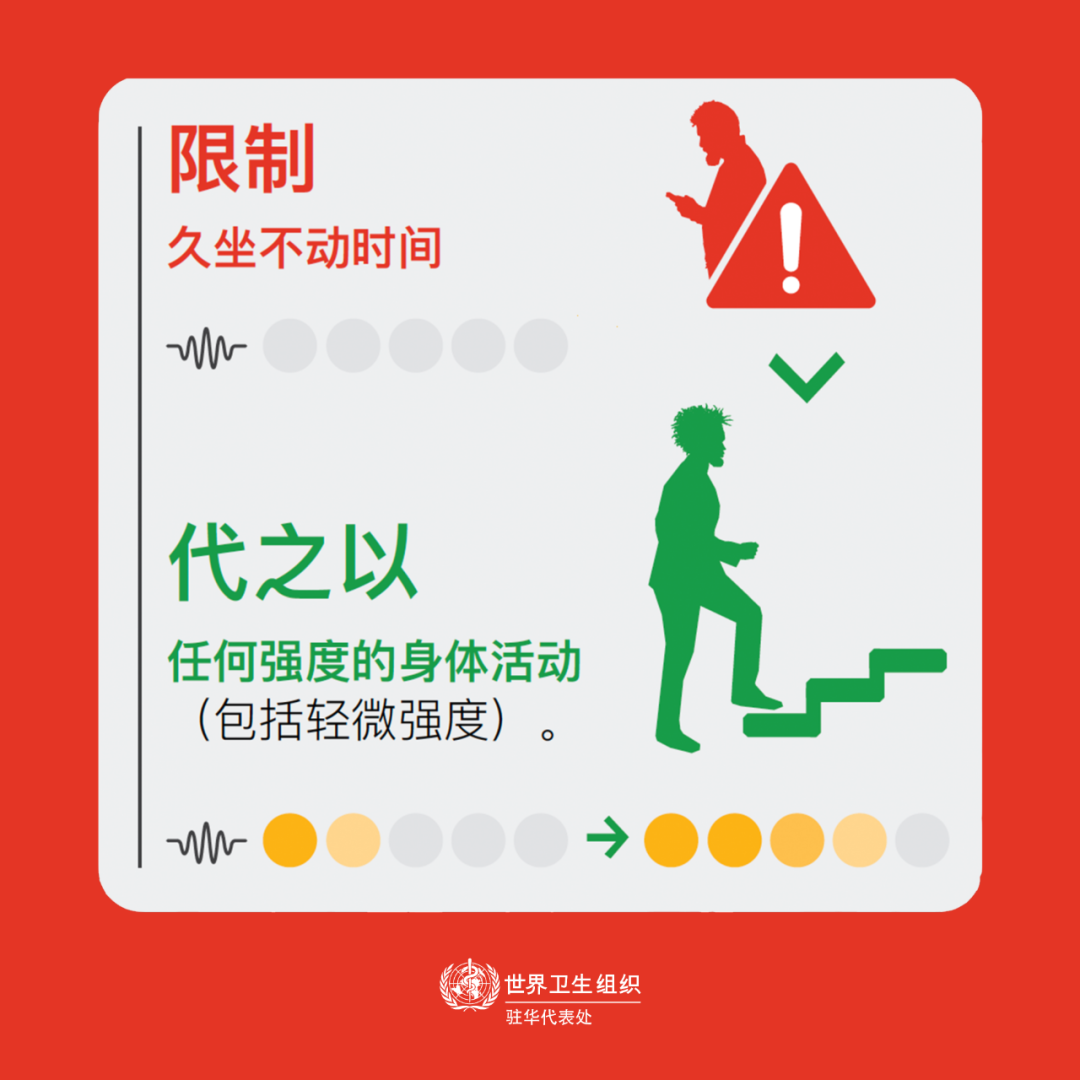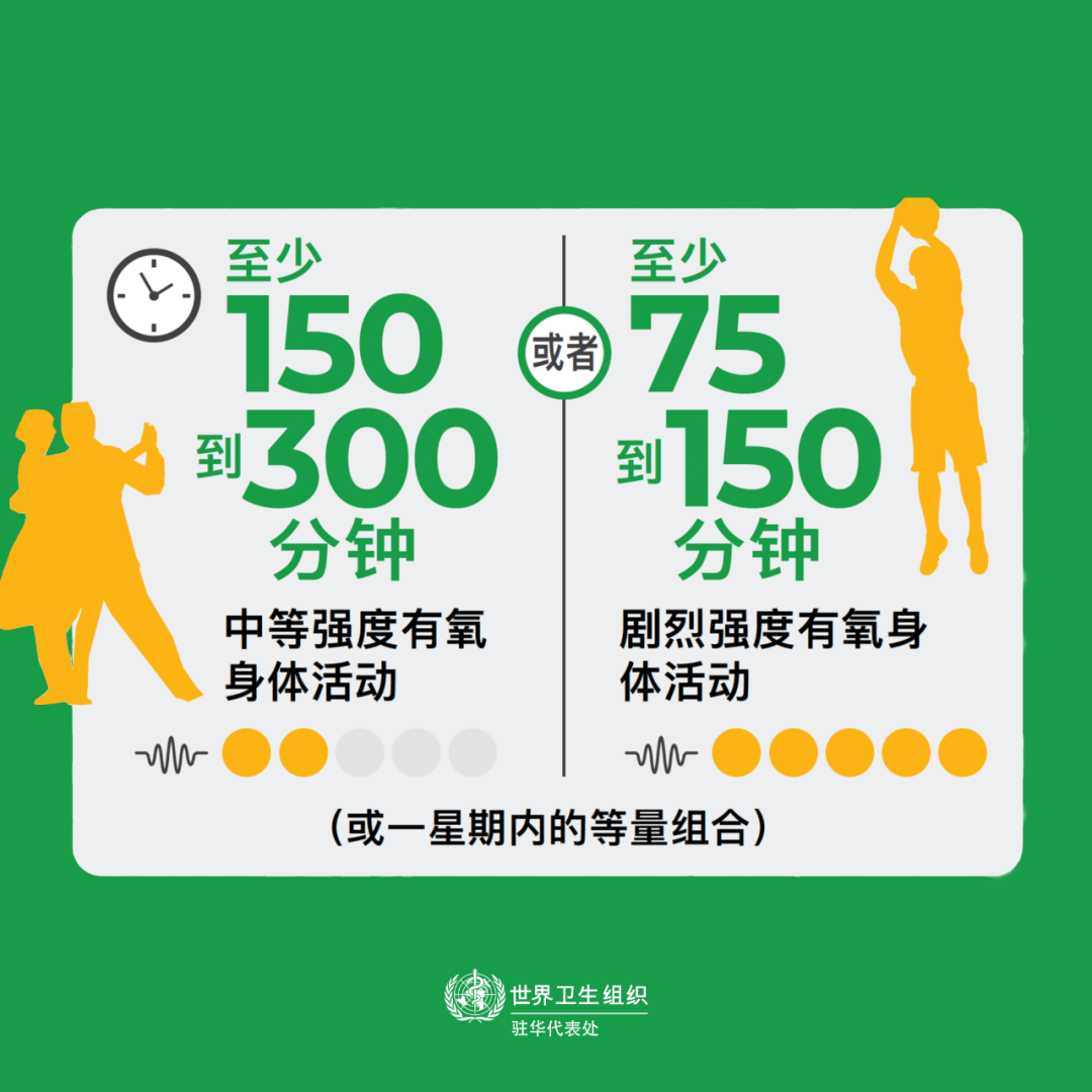 世卫组织最新身体活动指南建议所有成年人,包括慢性病患者或残障人士,每周至少进行150至300分钟的中等到剧烈的有氧活动。