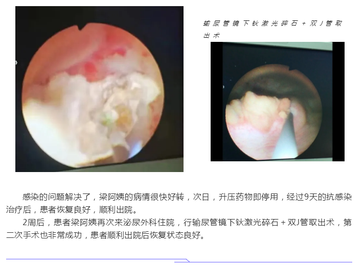 说起输尿管结石,很多得过此病的患者脑海里会立刻浮现出那种“痛到灵魂震颤的腰痛”——寻常的止痛药似乎都难以起效,不少患者还需要强力的杜冷丁来压制疼痛。而在临床上,得了输尿管结石的患者不一定会感到疼痛,但病情的危急程度却是“咄咄逼人”,难以“对付”,伴随疾病而来的严重感染甚至会危及患者生命。 40℃!高温加休克! 梁阿姨因为寒战发热伴胸闷、恶心呕吐于3月23日到新昌县中医院就诊。因为急诊初步的检查并没有找到明显的感染病灶,患者也未有明显的疼痛感受,检查结果却出现血压偏低,且肺部CT发现肺动脉扩张,属于病情严重的临床表现,于是收住入院治疗。 入院当晚,梁阿姨体温迅速攀升到了40°C,伴随着呼吸越来越急促,病人也越来越烦躁。因为患者入院后查了肺动脉CTA发现有肺动脉栓塞的表现,医生们开始考虑:这是不是因为合并肺栓塞导致的呢? 因为病情危重,梁阿姨当晚即被紧急转去ICU。在接下来的2小时内,患者血压却越来越低,最低的时候只有66/51毫米汞柱——这是典型的休克表现,更是心跳骤停的危险讯号! 锁定病因 精准打击 面对患者的凶险病情,ICU医生大脑高速运转,一方面为患者大量地补液,将抗生素升级到“泰能”,去甲肾升血压,全力控制危险局势;一方面缕清头绪“认真复盘”,仔细查看患者入院后紧急做的肺动脉CTA,发现检查结果不仅仅提示有肺栓塞,还有左肾盂及输尿管的扩张积液,这是输尿管结石伴积水的表现,不排除严重感染的可能!那么目前的病情变化到底是肺栓塞引起的梗阻性休克呢,还是泌尿系统感染引起的脓毒性休克呢? ICU的值班医生立即请泌尿外科的俞寅副主任医师前来会诊,俞医师拥有10余年的泌尿外科临床经验,他看完患者的CT,当即考虑患者的输尿管结石伴感染非常严重,休克的“源头”也正在于此处,必须立即实施手术。 按下感染"停止键" , 妙手“碎石”